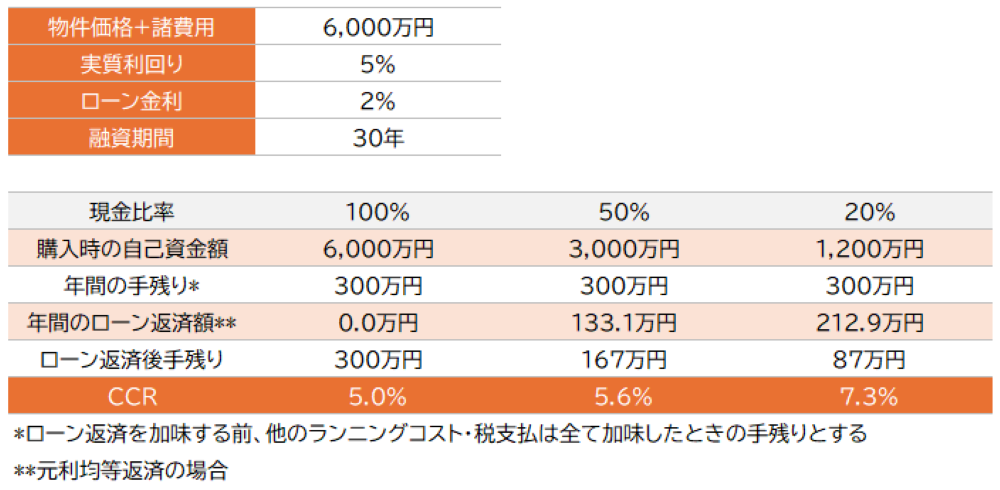 例えば、同一条件の物件を購入する際、自己資金比率を100%、50%、20%とした場合の収益構造とCCRの変化は以下のようになります。