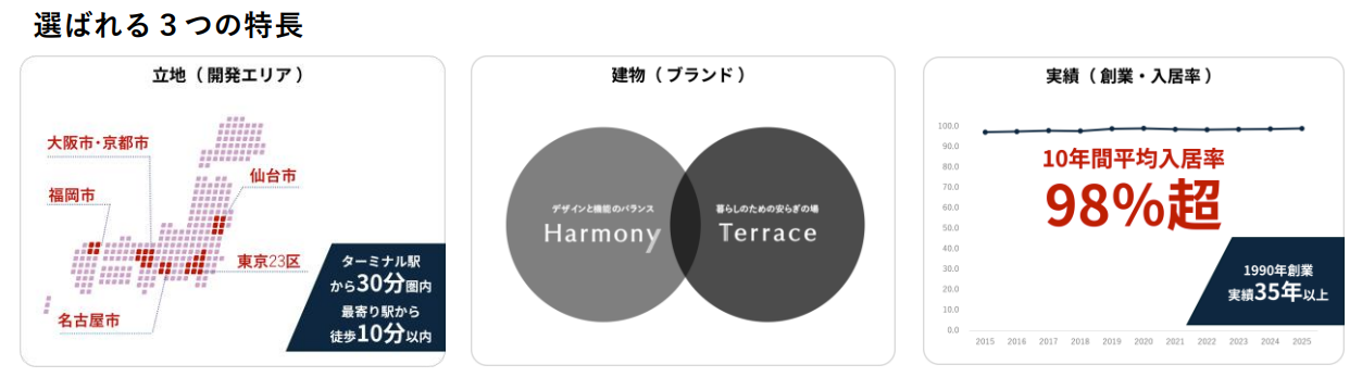 第三に、35年以上の実績とワンストップ体制が挙げられる。土地の仕入れから設計・施工、賃貸管理までを自社で完結させる体制と、金融機関との強固な提携に基づく融資提案により、初めてアパート経営に取り組む顧客も安心して始められるサポートを提供。この独自の賃貸管理ノウハウにより、直近10年間の平均入居率は98%超という高い水準を維持している。