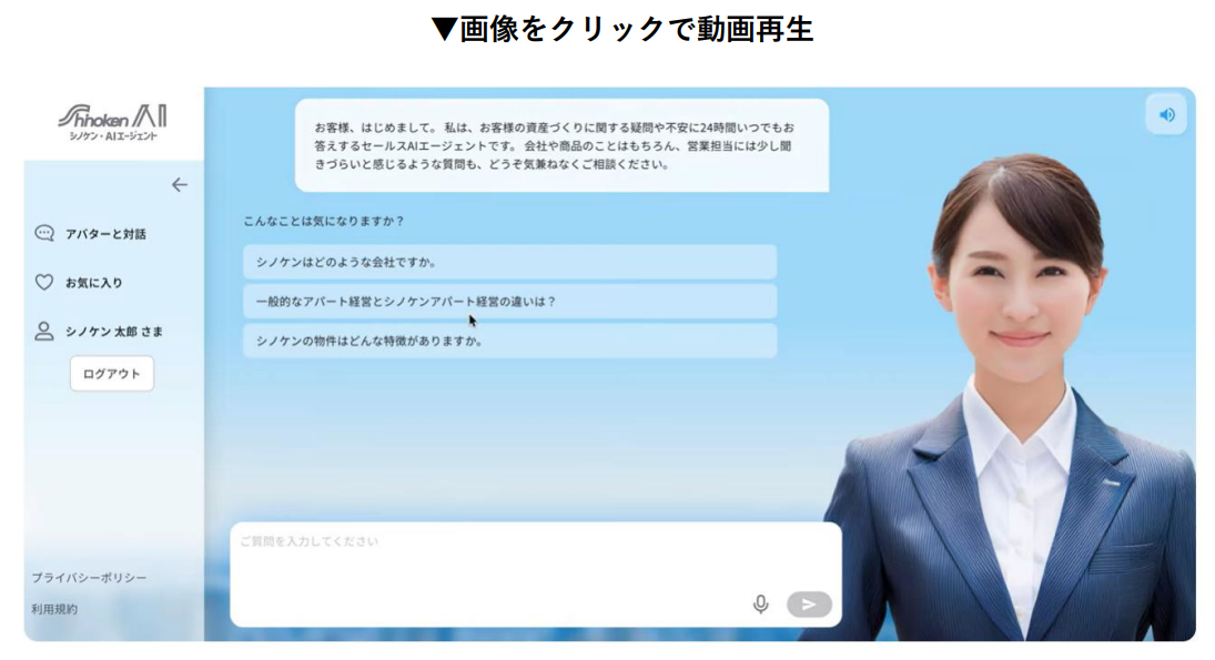 株式会社シノケングループ(以下、シノケングループ)と株式会社PKSHA Technology(以下、PKSHA)は2026年1月9日、生成AIを活用した対話型アバターによる不動産投資相談サービス「シノケン・セールス AI エージェント」の提供を開始した。