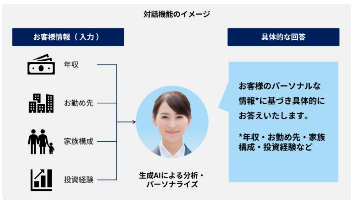 顧客体験(UX)の面では、対話の内容に応じて関連資料や解説動画を画面上に即座に提示する機能を備える。また、年収、勤務先、投資経験といった顧客の個別事情(属性)を踏まえたシミュレーションや提案を行う「パーソナライズ対話」機能を搭載しており、顧客は時間や場所を選ばずに、自身の状況に合わせた投資検討を進めることができる。